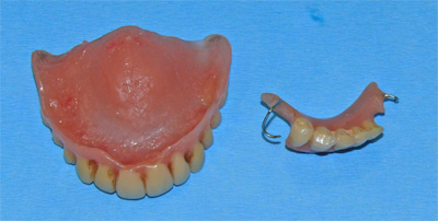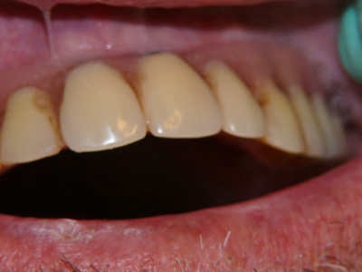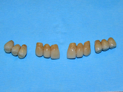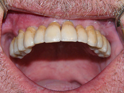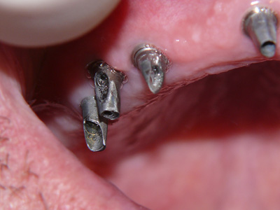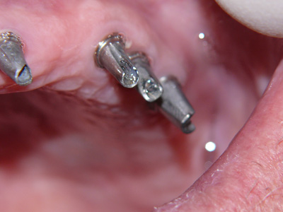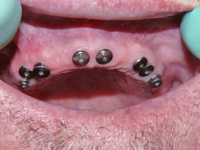 1 Protesi totale superiore che il paziente portava prima della riabilitazione fissa su impianti – 2 Protesi totale superiore nel cavo orale che il paziente portava prima della riabilitazione – 3 Impianti in fase di guarigione arcata superiore – 4 Monconi protesici avvitati su impianti lato destro – 5 Monconi protesici avvitati su impianti lato sinistro – 6 Manufatti protesici arcata superiore – 7 Riabilitazione fissa su impianti arcata superiore fase finale